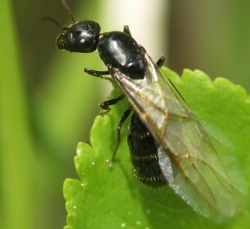 - Männchen: Glänzend schwarz wie Arbeiterinnen und Königin, kleiner Kopf, Gaster kleiner als bei Königin