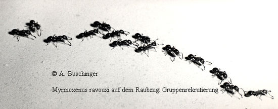 Nach mehr oder weniger langer Zeit verendet die Wirtskönigin. Inzwischen wird die Parasitenkönigin von den Wirtsarbeiterinnen gefüttert und beginnt mit der Eiablage. Die erste Brut besteht aus Myrmoxenus-Arbeiterinnen. Die Arbeiterinnen erkunden benachbarte Wirtsart-Nester und führen Raubzüge auf diese durch. Ein fündiger Scout führt eine kleine Schar von 10-15 Myrmoxenus-Arbeiterinnen auf einer kurzlebigen Duftspur zum Wirtsnest (Gruppenrekrutierung). Dort kämpfen die Myrmoxenus-Arbeiterinnen mit ihren Giftstacheln gegen die Verteidiger. Ist das Wirtsvolk überwältigt, werden dessen Arbeiterinnen-Puppen von den Sklavenhaltern in ihr Nest getragen, wo sie sich zu weiteren Sklaven entwickeln.