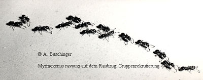 Diese Sklavenjäger sind 2,5 bis 3 mm lang. Das vorderste Tier (rechts) legt eine kurzlebige Duftspur, auf der es die kleine "Armee" zum vorher entdeckten Nesteingang eines Volkes der Sklavenart (hier: Temnothorax unifasciatus) führt.